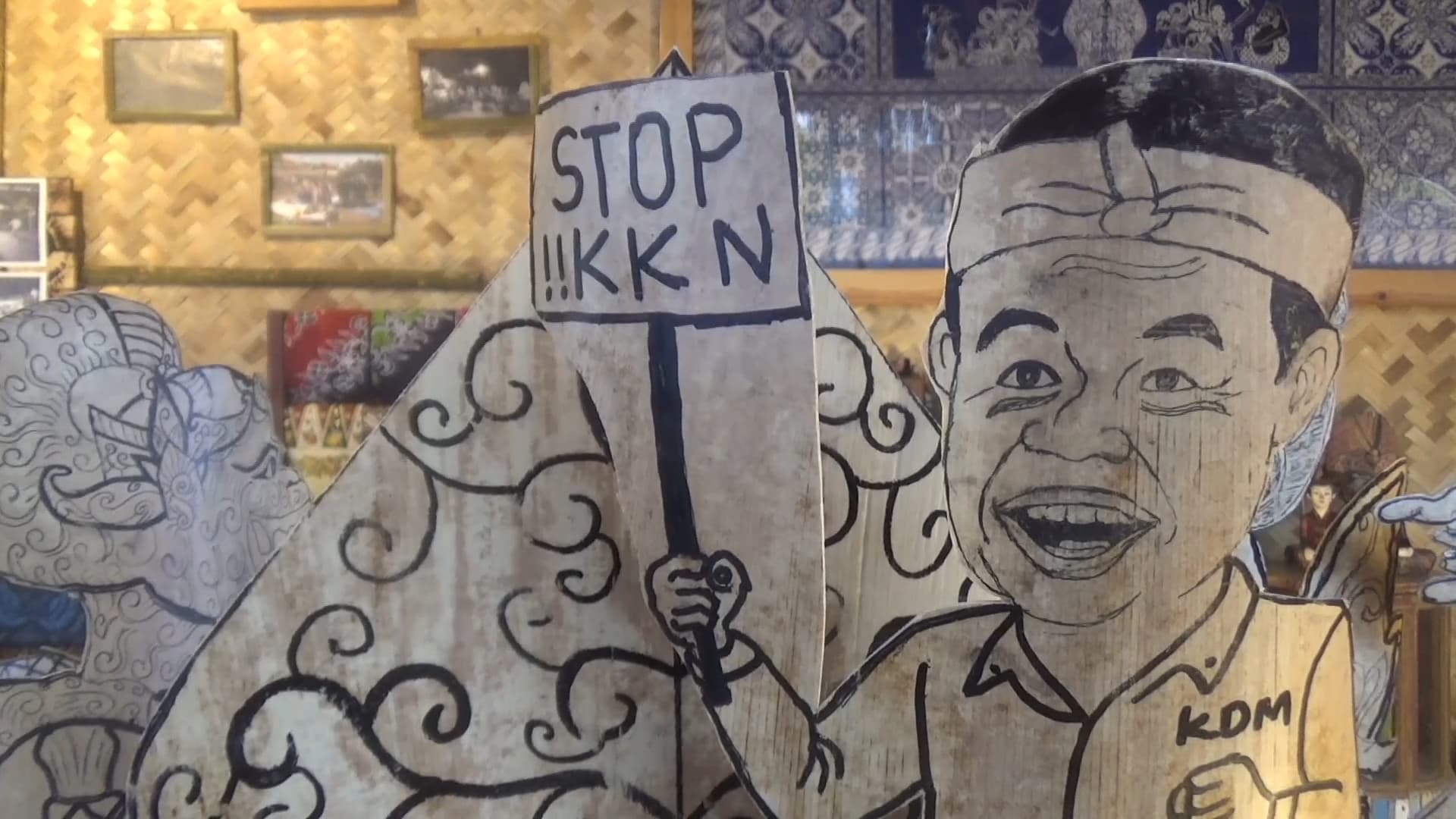 Pandangan mata warga pun tertuju dengan wayang karakter KDM sedang menegakkan pesan bernada 'Stop KKN'.
