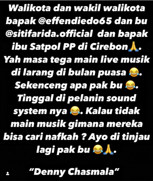 “Walikota dan Wakil Walikota bapak @effendiedo65 dan bu @sitifarida.pfficial dan bapak ibu Satpol PP di Cirebon. Yah, masa tega main live musik di larang di bulan puasa. Tinggal di pelanin sound system nya. Kalau tidak main musik gimana mereka bisa cari nafkah? Ayo di tinjau lagi pak bu,” demikian dikatakan Denny Chasmala dalam postingannya.