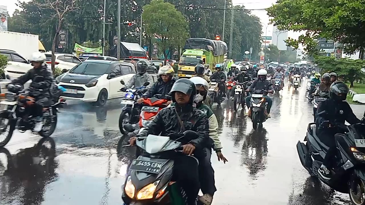 Ribuan pemudik terlihat tetap melaju meski harus mengenakan jas hujan. Sejumlah pemudik pun terpaksa menepi untuk berteduh di rest area BPBD yang berada di halaman parkir Perpustakaan 400 maupun di warung-warung PKL dadakan, dan ada juga menepi hanya untuk memakai jas hujan.
